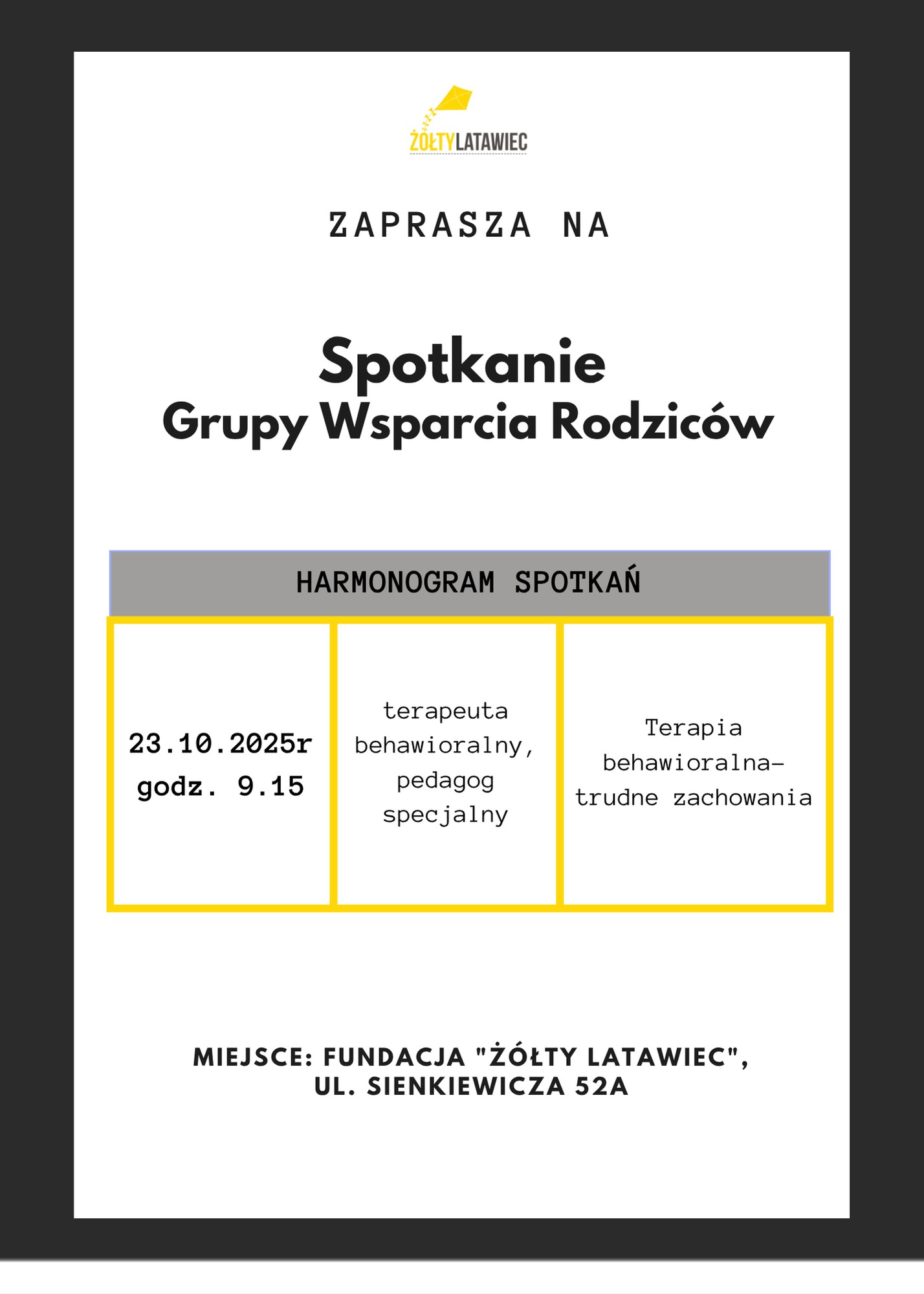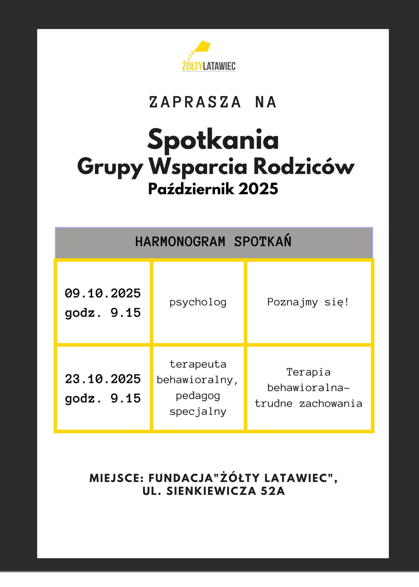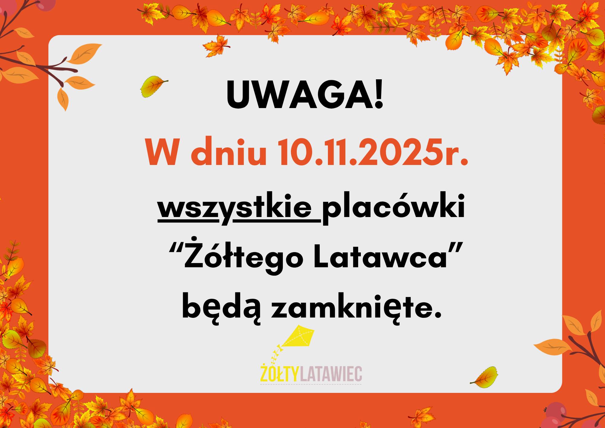 Uwaga! Informujemy, że w dniu 10.11.2025r. (poniedziałek) wszystkie placówki „Żółtego Latawca” będą zamknięte!
