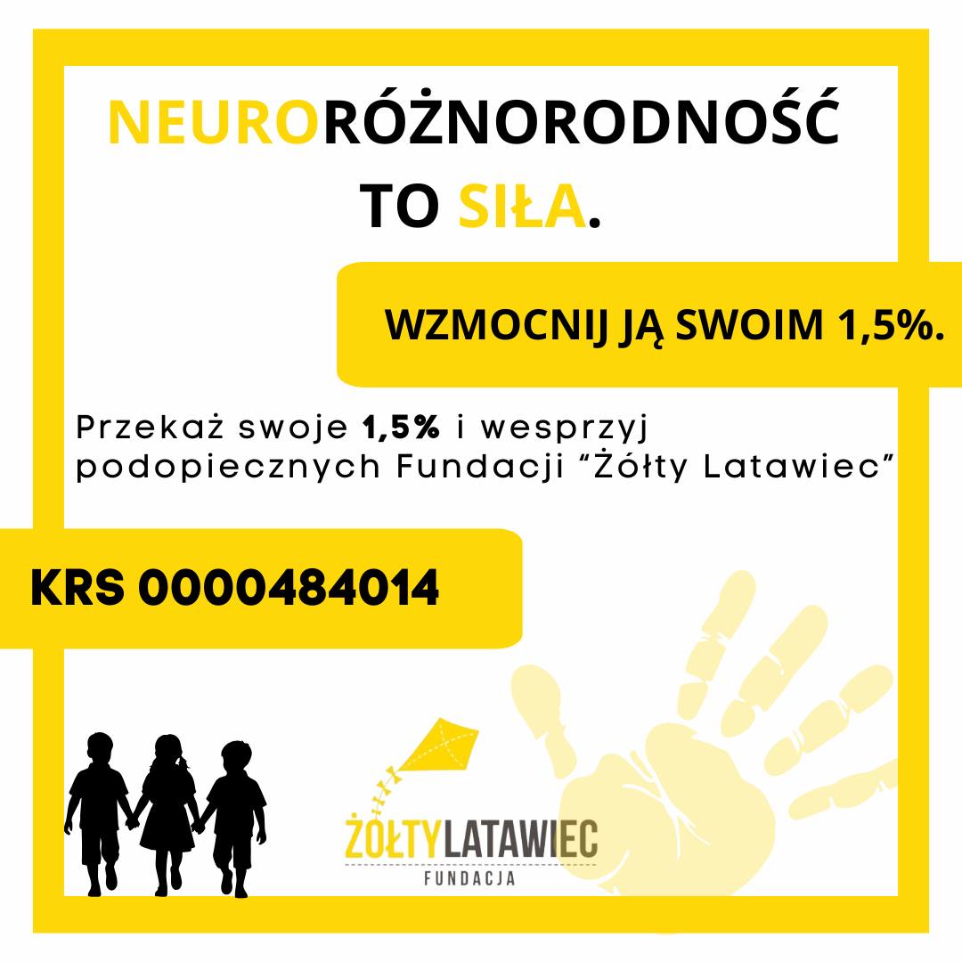 Neuronoróżnorodność to siła. Każdy umysł jest inny – i właśnie w tej różnorodności tkwi moc. Przekazując 1,5% swojego podatku, możesz realnie wesprzeć podopiecznych Fundacji „Żółty…