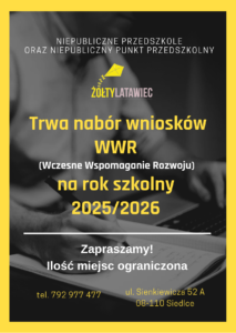 Uwaga! Przypominamy, że trwa nabór wniosków na WWR (Wczesne Wspomaganie Rozwoju) na rok szkolny 2025/2026