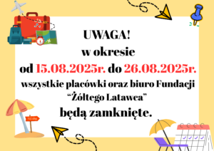 Uwaga!Informujemy, że wszystkie placówki oraz biuro Fundacji „Żółty Latawiec” będą zamknięte od dnia 15.08.2025r. do 26.08.2025r.