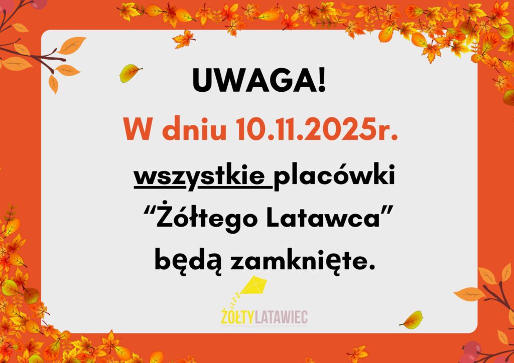 Dnia 10.11.2025r. wszystkie placówki „Żółtego Latawca” będą zamknięte ilona 2025-10-21 aktualnosci Uwaga!Informujemy, że w dniu 10.11.2025r. (poniedziałek) wszystkie placówki „Żółtego Latawca” będą zamknięte!Nawigacja wpisuPoprzedni Poprzedni wpis: Ostatnie wolne miejsce na zajęcia TUS!Następny Następny wpis: Spotkanie w ramach klubu rodzica w dniu 23.10.2025r.