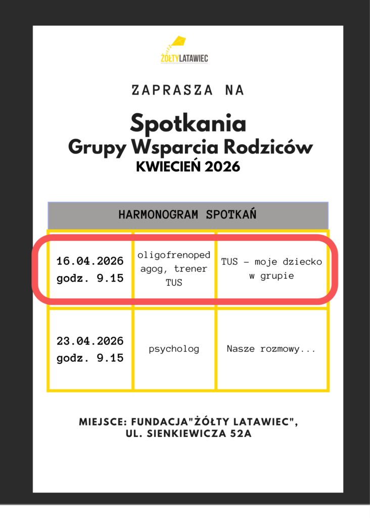 Przypominamy o nadchodzącym spotkaniu Grupy Wsparcia Rodziców z trenerem TUS w czwartek 16 kwietnia o godzinie 9:15.
