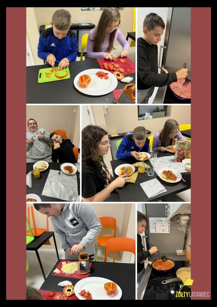 W kuchni było dużo współpracy — krojenie, mieszanie, pilnowanie makaronu, doprawianie sosu. Każdy miał swoją rolę, a całość wymagała cierpliwości, wspólnego działania, planowania krok po kroku i rozwiązywania drobnych trudności, które pojawiały się po drodze.